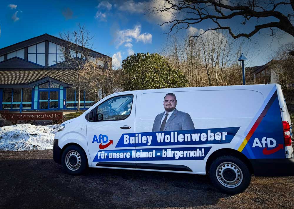 Bailey Wollenweber steht nachts an einer Straße im Winter neben einem Wahlplakat der AfD. Er trägt eine schwarze Jacke mit gelbem Innenfutter und zeigt mit dem Daumen nach oben. Neben ihm hängt ein großes blaues Wahlplakat mit dem Porträt von ihm selbst im Anzug sowie der Schriftzug eines Landtagskandidaten der AfD für den Wahlkreis Bad Marienberg/Westerburg.